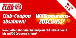 Personen, die sich zwischen dem 02.11.2020 und 06.11.2020 in einem MediaMarkt in Deutschland oder unter mediamarkt.de für den MediaMarkt Club anmelden, den Newsletter abonnieren und für mindestens 100,00 € einkaufen, erhalten einen MediaMarkt Club-Coupon. Die Höhe des Coupons ist abhängig vom Einkaufwert wie folgt gestaffelt: ab 100,00 bis 199,99 EUR Einkaufswert: 10,00 EUR Coupon; ab 200,00 bis 299,99 EUR: 20,00 EUR Coupon; ab 300,00 bis 399,99 EUR: 30,00 EUR Coupon; ab 400,00 bis 499,99 EUR: 40 EUR Coupon und ab 500,00 EUR Einkaufswert: 50 EUR Coupon. Nicht zum Einkaufswert zählen: Verträge mit Drittanbietern, Verkäufe von Drittanbietern (Online erkennbar an „Versand erfolgt durch xxx“), sämtliche Download- / Content- / GamingCards, Gutschein(-karten /-boxen), Prepaid-Aufladekarten / -Services, E-Books / Bücher, digitale Guthabenkarten, Zusatzgarantien, Lieferservice, Reparaturdienstleistungen, Fotoservice, Lebensmittel, Tchibo Cafissimo Produkte, IQOS, E-Zigaretten, Heets, Liquids und Versandkosten.Keine Barauszahlung. Der Coupon-Code ist frühestens 28 Tage nach Kauf im Coupon-Center ihres Club-Kontos abrufbar. Der Coupon ist in allen Media Märkten in Deutschland sowie unter mediamarkt.de einmalig bis 4 Wochen nach Erhalt und ab einem Mindesteinkaufswert (5-fache Höhe des Coupon-Wertes) einlösbar. Coupon nicht einlösbar für: Verträge mit Drittanbietern, Verkäufe von Drittanbietern (Online erkennbar an „Versand erfolgt durch xxx“),sämtliche Download- / Content- / GamingCards, Gutschein(-karten /-boxen), Prepaid-Aufladekarten / -Services, E-Books / Bücher, digitale Guthabenkarten, Zusatzgarantien, Lieferservice, Reparaturdienstleistungen, Fotoservice, Lebensmittel, Tchibo Cafissimo Produkte, IQOS, E-Zigaretten, Heets, Liquids und Versandkosten. Bei (teilweiser) Rückgabe der Ware erfolgt keine (teilweise) Neuausgabe des eingelösten Coupons. Nicht kombinierbar mit anderen Aktionen und weiteren Club €-Wert Coupons.