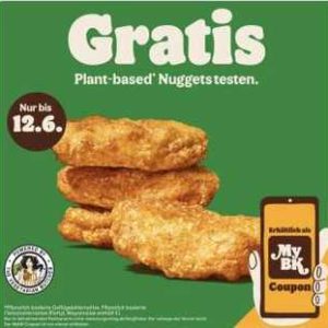 Probier jetzt gratis die Plant-based* Nuggets – 0% Fleisch. 100% Geschmack. Nur bis 12. Juni und nur als MyBK-Coupon erhältlich. Noch kein MyBK-User? Einfach in der BK-App anmelden, Coupon am Drive-in oder Take-away einlösen und gratis genießen. Nur für kurze Zeit und nur solange der Vorrat reicht. Übrigens: Wir erweitern stetig unser Plant-based Sortiment mit Zutaten von The Vegetarian Butcher. Welche Produkte es bereits gibt, erfährst du hier. Auf unseren Social-Media-Kanälen kannst du außerdem verfolgen, welche Aktionen im weltweit ersten Plant-based Burger King® Restaurant in Köln laufen. Du findest uns auf Facebook, Instagram und TikTok.
