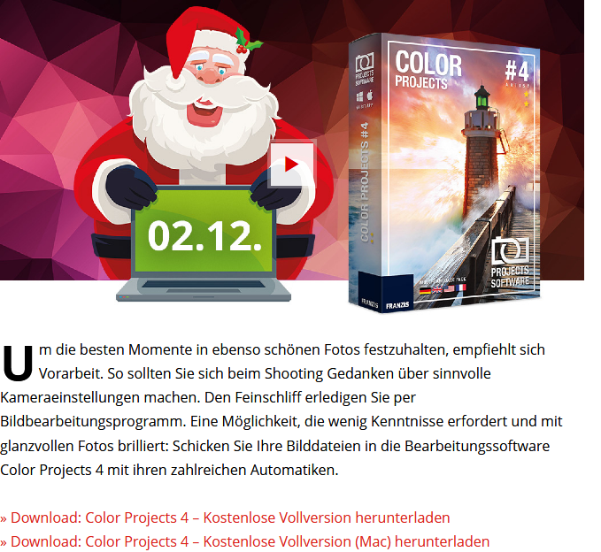 Tayfun 02.12.2019, 08:31 #Bei Computer Bild 2 Tag das Fotoprogramm: Color Projects 4 als kostenlose Vollversion.