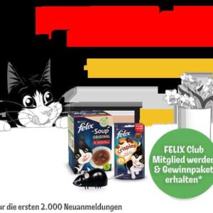 Bei der Registrierung im FELIX Club im Zeitraum vom 20.03.2024-03.04.2024 gibt es ein FELIX Produktpaket (bestehend aus 1xFELIX Soup, 1xFELIX Crispies und 1x laufende Maus) gratis dazu. Die gratis Zugabe kann nur einmalig mit der Registrierung im FELIX Club im Aktionszeitraum erhalten werden. Das Angebot ist auf die ersten 2.000 gültigen Neuanmeldungen begrenzt und kann nur erhalten werden, wenn die vollständige Anschrift bei der Anmeldung hinterlegt wird. Die Produktpakete werden nach Ende des Aktionszeitraums versendet. Teilnehmer müssen 18 Jahre oder älter sein. Die Teilnahme über die Einschaltung Dritter ist ausgeschlossen. Der Rechtsweg ist ausgeschlossen