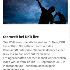 DKB Aktivskunde können ab dem 28. August 2019 für Planetarium und Tecknickmuseum Tickets für sich und eine Begleitperson sichern.