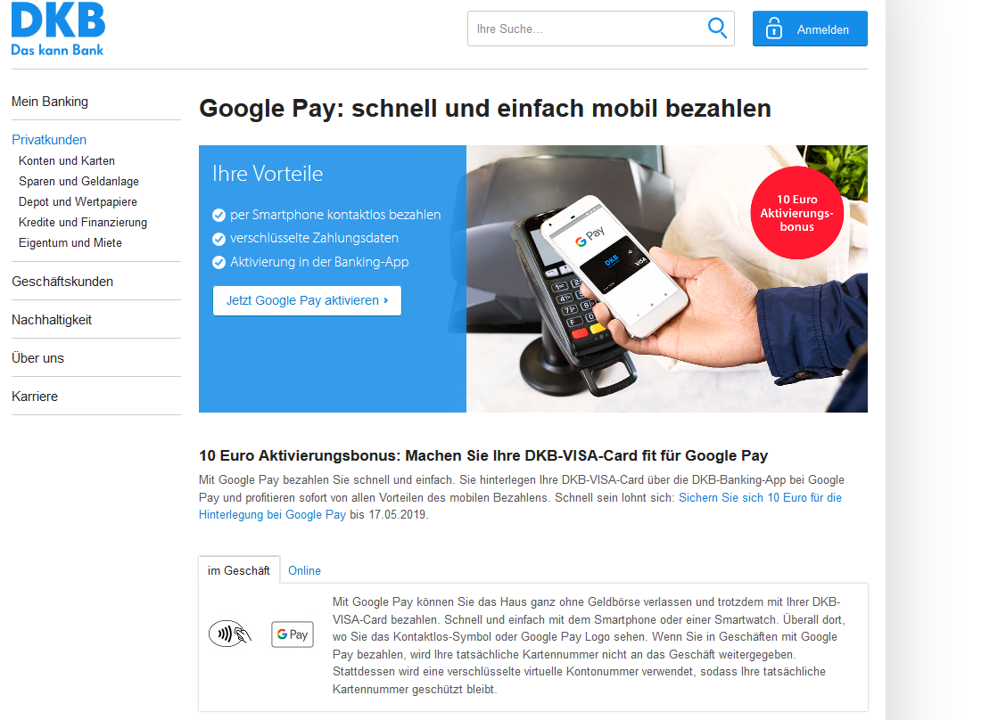 Tolle Aktion! 10 Euro Aktivierungsbonus: Machen Sie Ihre DKB-VISA-Card fit für Google Pay.