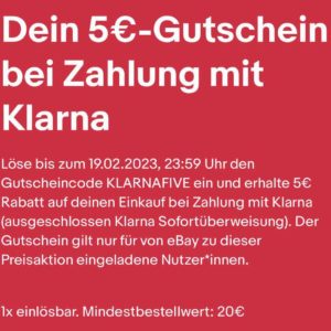 CaptainSaft 07.02.2023, 16:20 #Die Aktion ist noch nicht beendet. Die läuft noch bis zum 19.02.2023. Problem ist das der Gutscheincode personalisiert ist, soll heißen das er nicht mit jeden Account funktioniert. Hier die Aktionsseite mit Bedingungen https://pages.ebay.de/gutscheine/KLARNAFIVE/