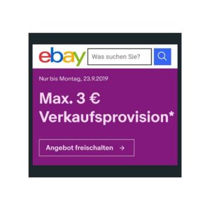 Keine Angebotsgebühr und maximal 3 Euro Verkaufsprovision pro Angebot, wenn Sie bei ebay.de im u.g. Aktionszeitraum einstellen Gültig für bis zu 100 eingestellte Artikel, soweit Ihr Verkaufslimit dies zulässt Hinweis: Artikel mit der Laufzeit “bis auf Widerruf” müssen innerhalb der ersten 30 Tage verkauft werden. Artikel, die mit der Option „automatisches Wiedereinstellen“ eingestellt wurden, müssen innerhalb der ersten Laufzeit (max. 10 Tage für Auktionen, max. 30 Tage für Festpreisangebote) verkauft werden. Danach fällt die volle Verkaufsprovision an.