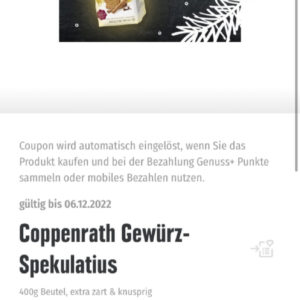 Nur heute, 06.12.2022, gibt es in der EDEKA-App eine Packung Coppenrath Gewürz-Spekulatius gratis ab einem Einkaufswert von 5€.