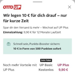 Ihr zahlt zunächst die regulären 9,90€ für die OTTO-Up Versandflat mit 12 Monaten Laufzeit. Anschließend erhaltet ihr 500 Bonuspunkte im Wert von 10€ als Cashback.