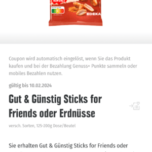 Hallo Leute, nächste Woche von 5. bis 11.02.2024 Bits in der App ab Einkauf von mindestens 15€ eine Packung Erdnüsse oder Sticks von Gut und günstig gratis.