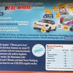 „Deal Wheel“- Aktionspackungen, die vor dem Aktionsstart (06.01.2025) erworben wurden, berechtigen zur Teilnahme. Die Aufbewahrung des Kassenbons ist zwingend erforderlich, um an der Aktion teilnehmen zu können.