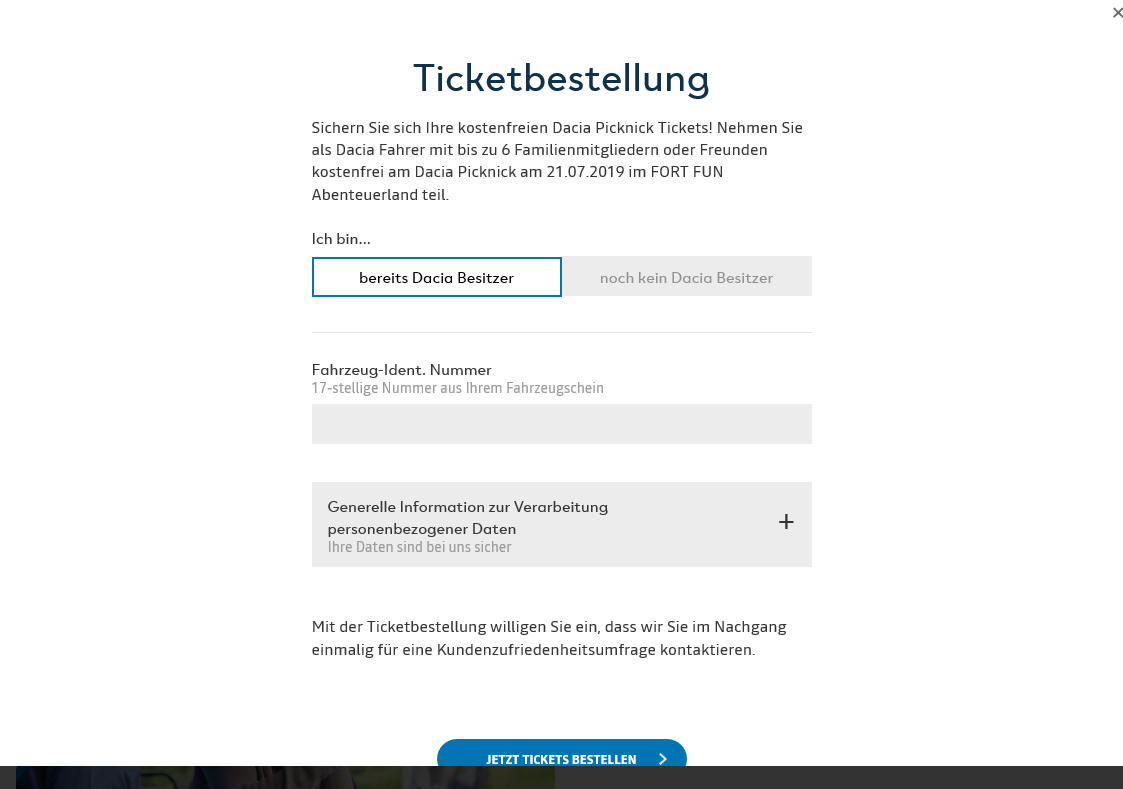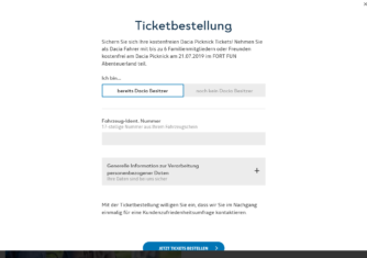 Um sich jetzt Tickets zu sichern, halten Sie einfach Ihre Dacia Fahrgestell Nummer (VIN) bereit. Sie fahren noch keinen Dacia? Dann nehmen Sie an unserer Verlosung teil und mit etwas Glück erwartet Sie ein unvergesslicher Tag.