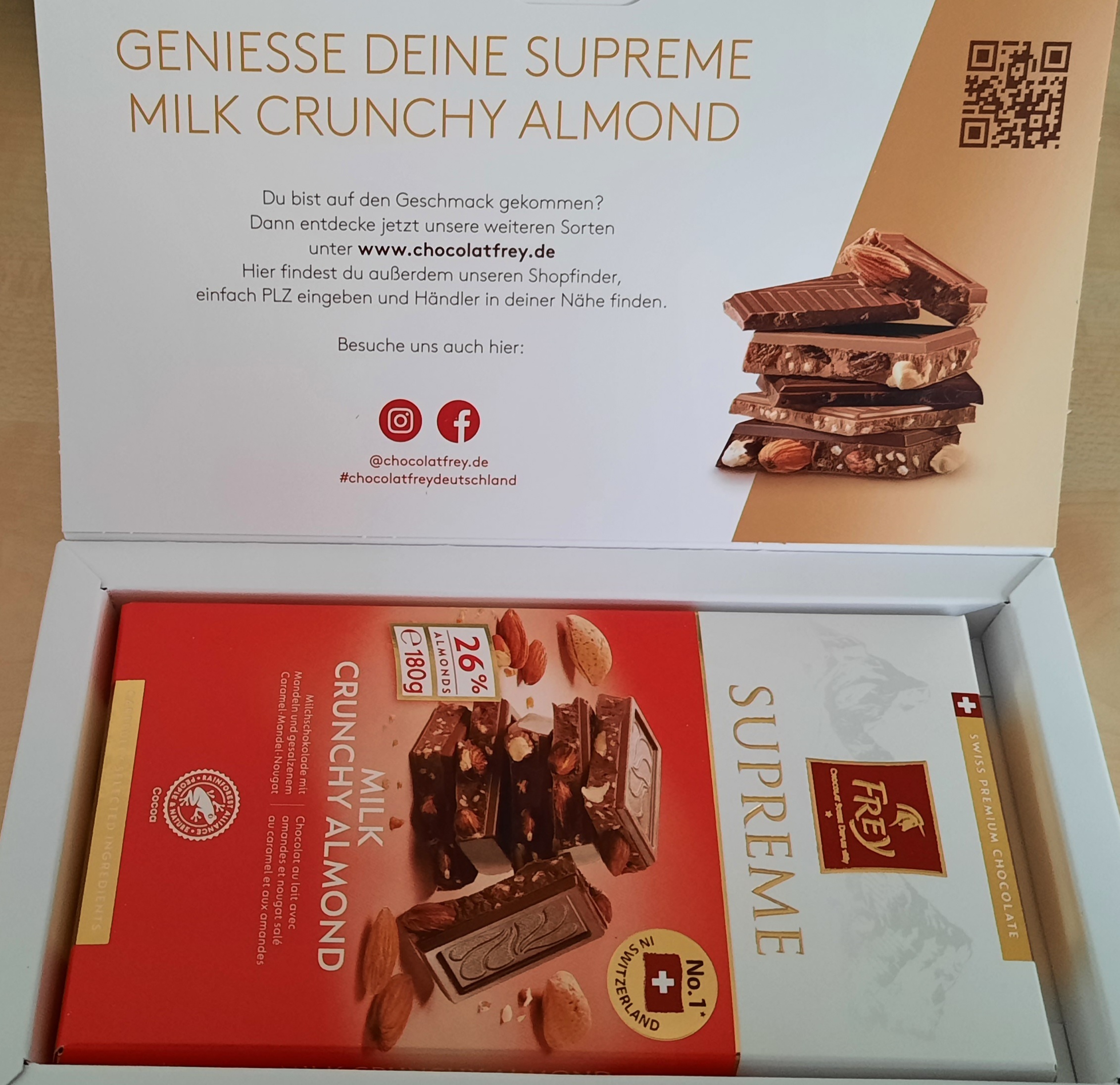 Frey schickt an die ersten 10.000 teilnahmeberechtigten Teilnehmern als Aktionsprodukt kostenlos eine 180g-Probiertafel Schokolade der Marke Frey®.