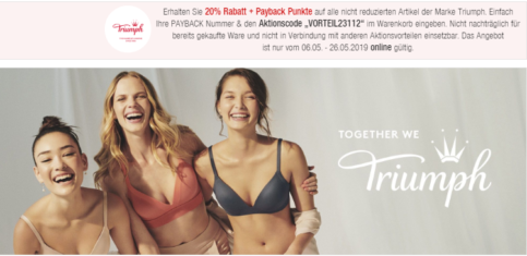 Erhalten Sie 20% Rabatt + Payback Punkte auf alle nicht reduzierten Artikel der Marke Triumph. Einfach Ihre PAYBACK Nummer & den Aktionscode „VORTEIL23112“ im Warenkorb eingeben. Nicht nachträglich für bereits gekaufte Ware und nicht in Verbindung mit anderen Aktionsvorteilen einsetzbar. Das Angebot ist nur vom 06.05. – 26.05.2019 online gültig.