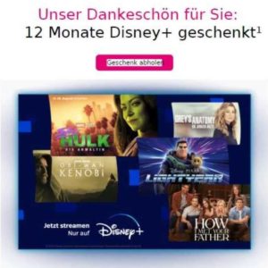 Daneben gilt: "Die Option "Disney+ by Telekom 12M geschenkt" ist ausschließlich für Privatkunden mit Mobilfunk-Tarifen (ab der 3. Generation) zubuchbar. Wenn zum Zeitpunkt der Buchung bereits ein anderes Disney+ Produkt über den Mobilfunk-Vertrag gebucht ist, kann das Geschenk nicht gebucht werden."