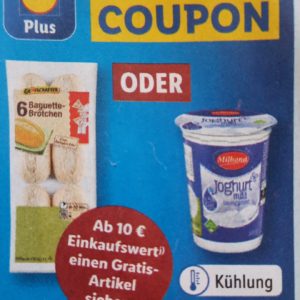 Ab 08.07. bis 09.07. erhaltet ihr bei Lidl entweder eine Packung Grafschafter Baguettebrötchen 6 Stück oder einen Becher 500 g Milbona Joghurt gratis zum Einkauf dazu. Mindest-Einkaufswert sind 10 €. Den Coupon müsst ihr in der Lidl plus App zunächst aktivieren, dann wird der Artikelpreis an der Kasse abgezogen