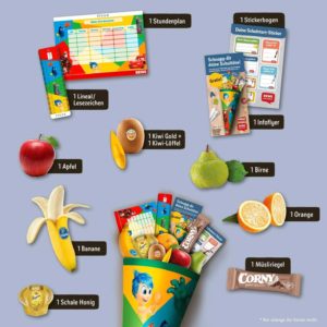 Freut euch schon auf praktische Schulutensilien und viele frische und gesunde Lebensmittel in der Schultüte der Erstklässler: