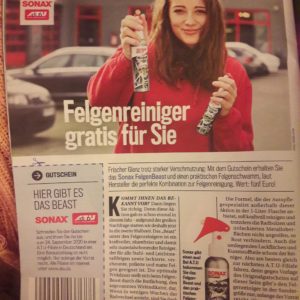 In der aktuellen Ausgabe der AutoBild (Nr. 37) gibt es auf Seite 62 einen Gutschein für eine 140ml-Flasche Felgenreiniger der Marke SONAX inkl. Felgenschwamm im Wert von 5€ zum Ausschneiden. Einzulösen ist der Gutschein bei A.T.U. (bis 24.09.2020 – nur solange der Vorrat reicht).
