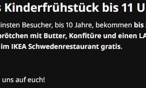Kinder bis 10 Jahre erhalten bei IKEA bis 31.08.2024 ein gratis Kinderfrühstück bis 11 Uhr. Das Frühstück besteht aus einem Milchbrötchen mit Butter, Konfitüre und einen LANGLUR Smoothie und ist im IKEA Schwedenrestaurant gratis erhältlich.