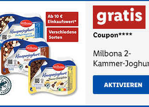 ****Aktion gültig vom 07.03.2023 bis 11.03.2023. Ab einem Einkauf im Wert von 10 € (ausgenommen Rettertüte, Tabakwaren, Zeitschriften, Säuglingsanfangsnahrung, Bücher, Pfand, CO₂ Zylinder, Telefon-, Gutschein- und Geschenkkarten) gibt es 175 g Milbona 2-Kammer-Joghurt gratis. Keine Barauszahlung möglich. Gültig in allen Filialen. Coupon nur einmalig einlösbar. Sämtliche Aktionsartikel können aufgrund begrenzter Vorratsmenge bereits im Laufe des ersten Angebotstages ausverkauft sein.