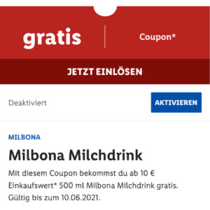 Bis zu 10.06.21 erhaltet ihr mit der Lidl Plus App einen Milbona Milchdrink gratis dazu. Das Angebot gilt ab 10 € Einkaufswert.