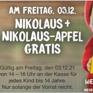 Denn dort bekommen alle Kinder bis 14 Jahre an der Kasse von 14:00 – 16:00 Uhr einen Schokoladen-Nikolaus (200 gr.) + einen roten Nikolaus-Apfel geschenkt.