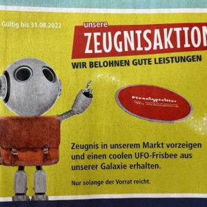 Also am Besten gleich euer Zeugnis in einer Filiale vorzeigen und einen UFO-Frisbee kostenlos mit nach Hause nehmen.