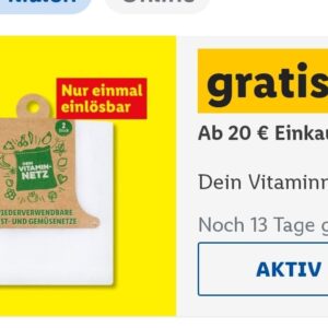 Vom 03.03.2025-15.03.2025 gibt es bei Lidl mit der App ein Vitaminnetz gratis. Ab einem Einkaufswert von 20 Euro.