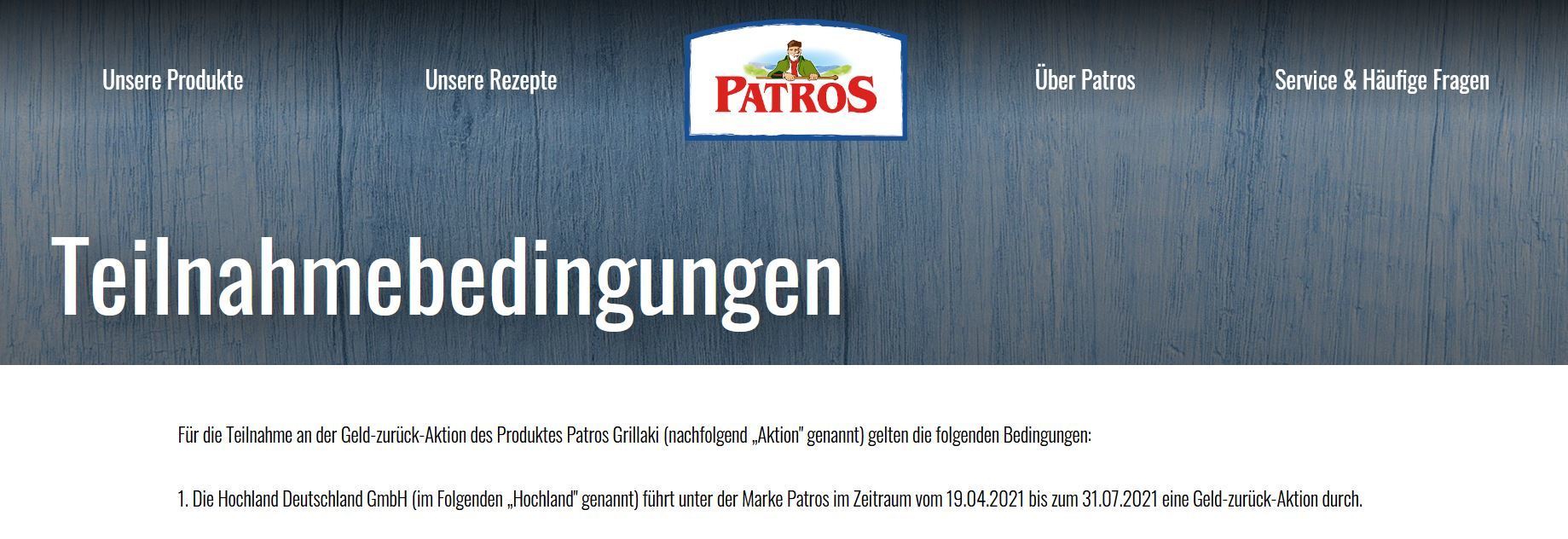 1. Die Hochland Deutschland GmbH (im Folgenden „Hochland" genannt) führt unter der Marke Patros im Zeitraum vom 19.04.2021 bis zum 31.07.2021 eine Geld-zurück-Aktion durch.
