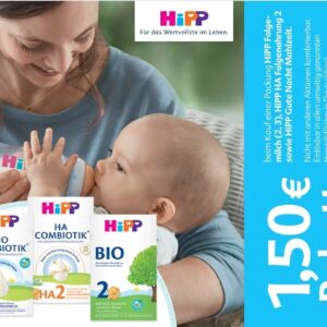 Beim Kauf einer Packung HiPP Folgemilch (2 , 4) HiPP HA Folgenahrung sowie HiPP Gute Nacht Mahlzeit.