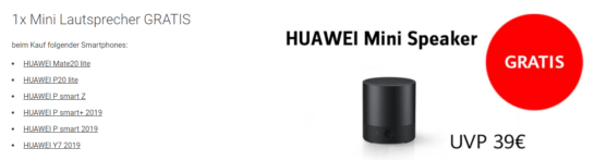 Wenn ihr euch ein Huawei P30 Lite bis zum 31.07.2019 kauft, könnt ihr zwei klangstarke HUAWEI MiniSpeaker Lautsprecher gratis dazu erhalten (Wert ca. 30€ pro Stück).