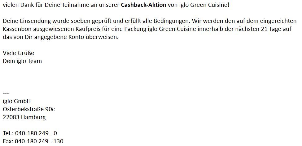 diki 13.01.2021, 18:04 #Bestätigungsmail von IGLO