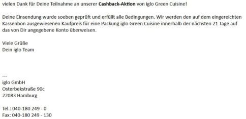 iglo erstattet dem Teilnehmer auf das angegebene Konto den auf dem Kaufbeleg ausgewiesenen Kaufpreis (bis maximal 5 Euro) eines Aktionsproduktes (iglo Green Cuisine.