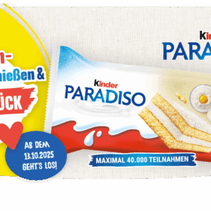 Jetzt wird Probieren zum Genuss: Mit der neuen „Gratis Testen“-Aktion von Ferrero können alle, die kinder Paradiso noch nicht kennen oder wiederentdecken möchten, die leckeren Biskuit-Schnitten kostenlos ausprobieren. Wer im Aktionszeitraum eine kinder Paradiso 4er-Packung kauft, erhält nach dem Hochladen des Kassenbons den Kaufpreis zurückerstattet.