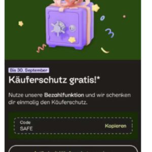 Vom 23.09. bis 30.09.2024 könnt ihr den Käuferschutz gratis erhalten, wenn ihr bei Kleinanzeigen.de über die integrierte Bezahlfunktion zahlt und den Aktionscode „SAFE“ eingebt. Das gilt für einen Kaufwert von bis zu 200 Euro (ohne Versandkosten). Wichtig: Der Code ist einmalig pro Nutzer gültig und nicht übertragbar.