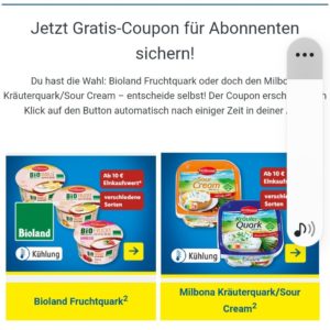 Gerade eine Mail von Lidl erhalten, für Abonnenten gibt es ab 10,00 Einkaufswert einen Artikel nach Wahl gratis. Entweder Bioland Fruchtquark oder Milbona Kräuterquark/SourCream. Einfach wählen und schon habt Ihr den Coupon in der App.