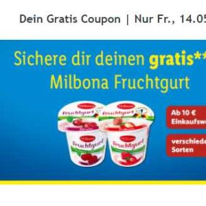 ****Aktion nur gültig am 14.05.2021. Ab einem Einkauf im Wert von 10 € (ausgenommen Tabakwaren, Zeitschriften, Säuglingsanfangsnahrung, Bücher, Pfand, CO₂ Zylinder, Telefon- und Gutscheinkarten) gibt es 150 g Milbona Fruchtgurt gratis. Keine Barauszahlung möglich. Gültig in allen Filialen. Coupon nur einmalig einlösbar. Sämtliche Aktionsartikel können aufgrund begrenzter Vorratsmenge bereits im Laufe des ersten Angebotstages ausverkauft sein.
