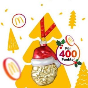 Ab 6.12 bis 7.12 gibt es eine Chicken McNugget Weihnachtskugel für 400 Punkte in der MyMcDonald’s App. Für 400 Bonuspunkte gibt es sie geschenkt. Schnell sein lohnt sich, sind bestimmt zeitig wieder alle. Nur solange Vorrat reicht.