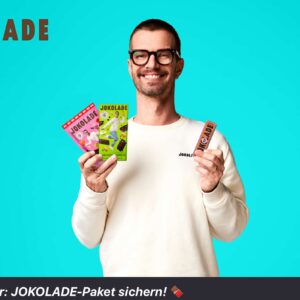 Aus Joko wird Schoko. Bestellen Sie jetzt Ihr kostenloses JOKOLADE-Genusspaket. Genießen Sie eine köstliche Tafel Schokolade, eine herzhafte Tüte Schoko-Peanuts in süß oder salzig und einen leckeren Riegel fur unterwegs. Die drei Leckereien sind nicht nur ein Genuss, sondern auch fair: Sie tragen das weiße Fairtrade-Produktsiegel und werden mit Kakao aus der Tony’s Open Chain hergestellt. Fair snacken ohne bitteren Beigeschmack!