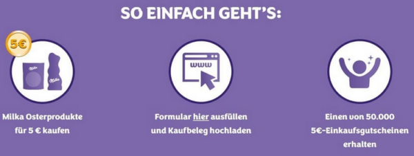 Für 5 EUR Milka Osterprodukte einkaufen und 5 EUR Einkaufsgutschein erhalten. Gilt für die ersten 50.000 Teilnehmer.