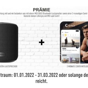 Wer ein teilnehmendes MSI-Produkt besitzt, kann bis zum 31.03.2022 eine Kundenrezension schreiben (Aufwand ca 5-10 Minuten) und Prämien im Wert von mehr als 60 Euro abstauben. Möglich dürfte wohl auch sein, sich jetzt noch ein teilnehmendes MSI-Produkt zu besorgen oder mal in seinem Rechner nachzuschauen, viele haben da MSI-Grafikkarten drin. Der hier abgebildete MSI-Bluetooth Lautsprecher hat einen ursprünglichen Verkaufspreis von 59,99 Euro. Dazu wird eine 3 Monatige Centr-Mitgliedschaft spendiert. Prämien können laut Test aber wohl auch andere sein, und das Angebot gilt solange der Vorrat reicht. Versandkosten fallen wohl keine an.