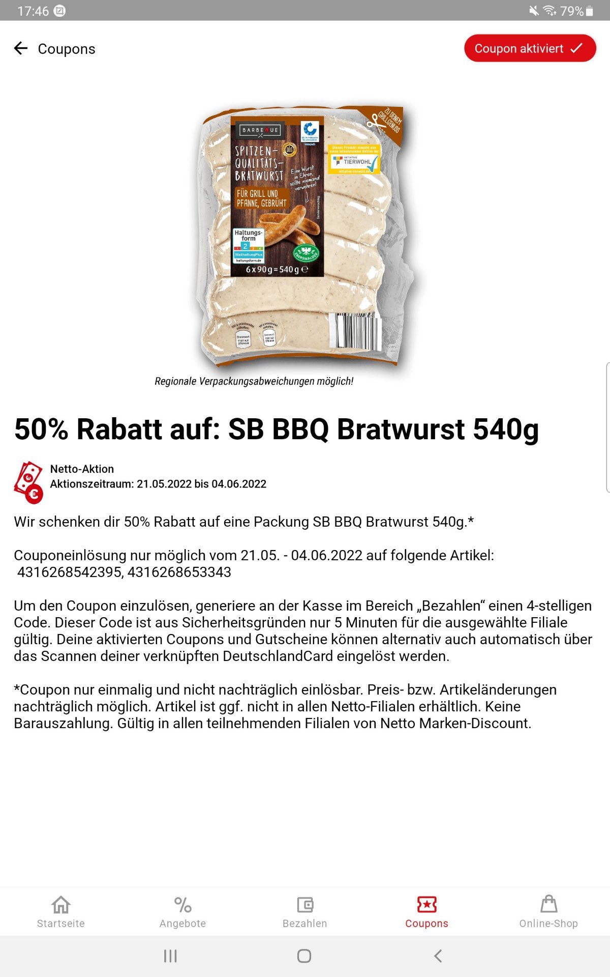 Cuppi (Gast) 22.05.2022, 17:44 #Hab Bratwurst Coupon 50% als Geschenk genommen.