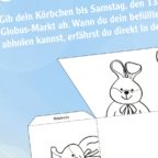 Die Kinder können es dann (natürlich vom Osterhasen kostenlos gefüllt) am 09.04.2020 persönlich von 10.00 – 18.00 Uhr beim Osterhasen im Globus Markt abholen kommen.