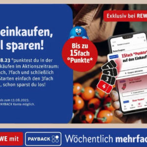 vom 17.07-13.08.2023 könnt ihr bei Rewe über die Rewe App bis 15 Fach Payback Punkte erhalten.