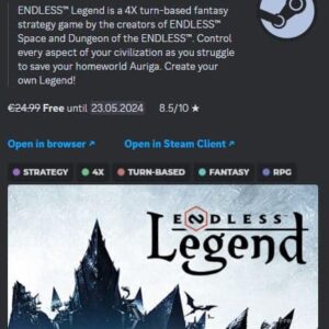 Auf Steam wird bis heute Abend (19.00 Uhr) das 4X-Sci-Fi-Fantasy-Strategiespiel „ENDLESS Legend“ verschenkt. Wenn man das Spiel bis dahin zu seinem Account hinzufügt, kann man es auch nach Ende der Aktion behalten und spielen.