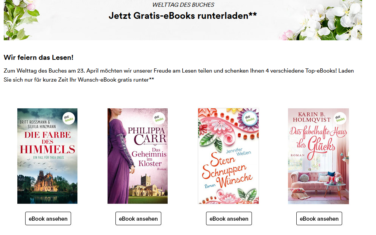 Zum Welttag des Buches am 23. April möchten wir unserer Freude am Lesen teilen und schenken Ihnen 4 verschiedene Top-eBooks! Laden Sie sich nur für kurze Zeit Ihr Wunsch-eBook gratis runter**
