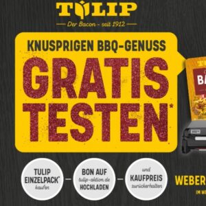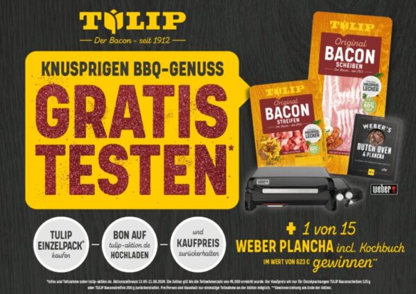 Kennt ihr schon Tulip und den Tulip Bacon? 😊 Jetzt habt ihr jedenfalls die Möglichkeit, ihn kostenlos zu probieren – denn aktuell könnt ihr Tulip gratis testen. Außerdem habt ihr bei der Aktion die Gelegenheit, einen von 15 Weber Plancha inklusive Kochbuch zu gewinnen. 🤩 Alle wichtigen Infos dazu, wie ihr Tulip Bacon gratis testen könnt, findet ihr hier übersichtlich zusammengefasst. 😊