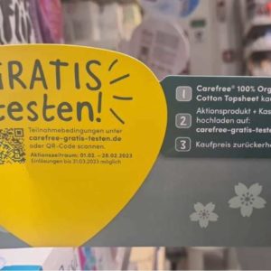 - Bild vom Aktionsprodukt + Kassenbon bis 31.03.2023 hochladen auf: carefree-gratis-testen.de