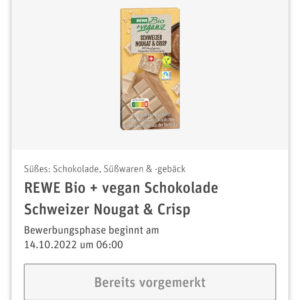 Es gibt wieder eine Vorankündigung für einen neuen Rewe Produkttest. Diesmal eine vegane Schokolade von „Rewe Bio + Vegan“ in der Sorte „Schweizer Nougat & Crisp“.