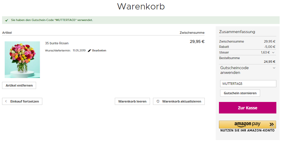 Bei Blume Ideal bekommt man aktuell 5€ Rabatt ab einem Mindestbestellwert von 20€ mit dem Gutschein-Code MUTTERTAG5.