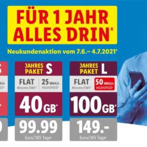 Die Lidl Connect Jahrespakete XS, S und L erhalten jeweils 12, 40 und 100 GB Datenvolumen. Die Preise liegen bei 59,99 Euro (XS), 99,99 Euro (S) und 149 Euro (L). Im größten Tarif wird die Geschwindigkeit von den üblichen 25 MBit/s auf 50 MBit/s erhöht.