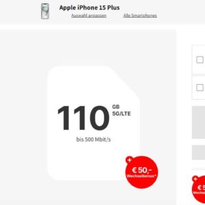 Apple iPhone 15 Plus mit 128GB, 110GB Vodafone XXL 5G/LTE bzw. 145GB Young-Vorteil für 59,90 Euro pro Monat