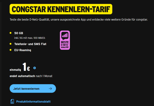 [Startseite]Congstar: 50GB 5G für 1€ im Telekom-Netz (Test-Tarif) – endet automatisch